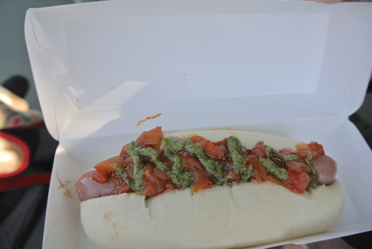 ワールドバザールにあります。クリスマス時期にしか売ってないクリスマスカラーのホットドッグを食べました。緑色のソースはバジル&ベジタブルソースです。ホットドッグの箱もクリスマスの絵柄がギフトボックスのように可愛かったです。