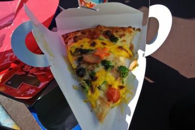 ファンタジーランドにあるフック船長のピザ屋さんです。いつでも熱々が提供されるので美味しい。ピザの生地はそれほど分厚くないので食べやすかったです。お昼時間帯を少し前倒しにして外すとそれほど並ばないですみました。