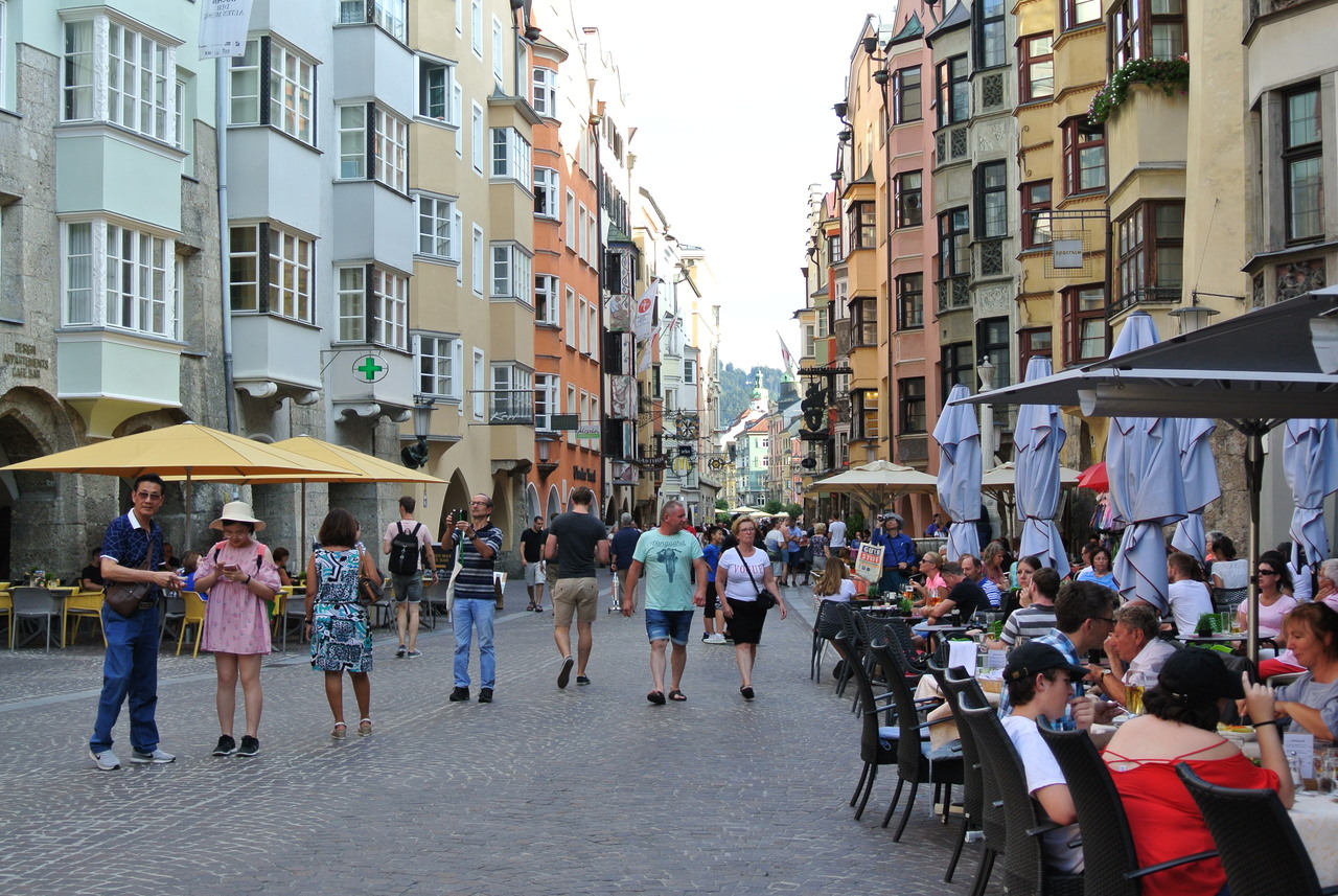 インスブルックのメインストリート、歩行者天国になっています。夏は多くの人で夜まで賑わっていました。カフェやレストランのテラス席も人でいっぱい。お土産や食事はここで済ませられそうです。この通りにあるカウフハウスチロルというショッピングモールは地下に大きなスーパーとフードコートがあり便利でした。