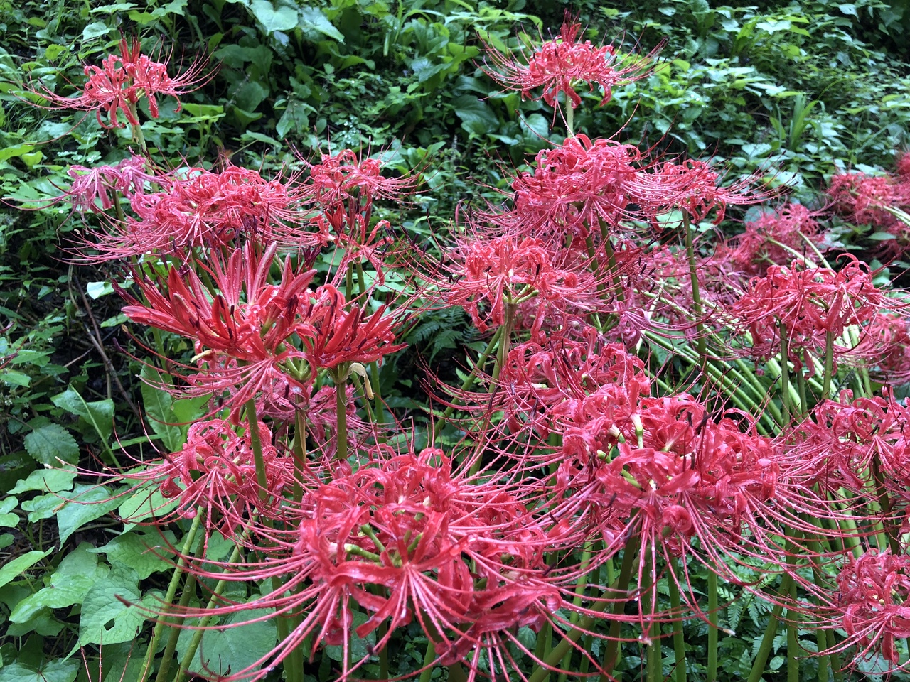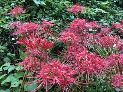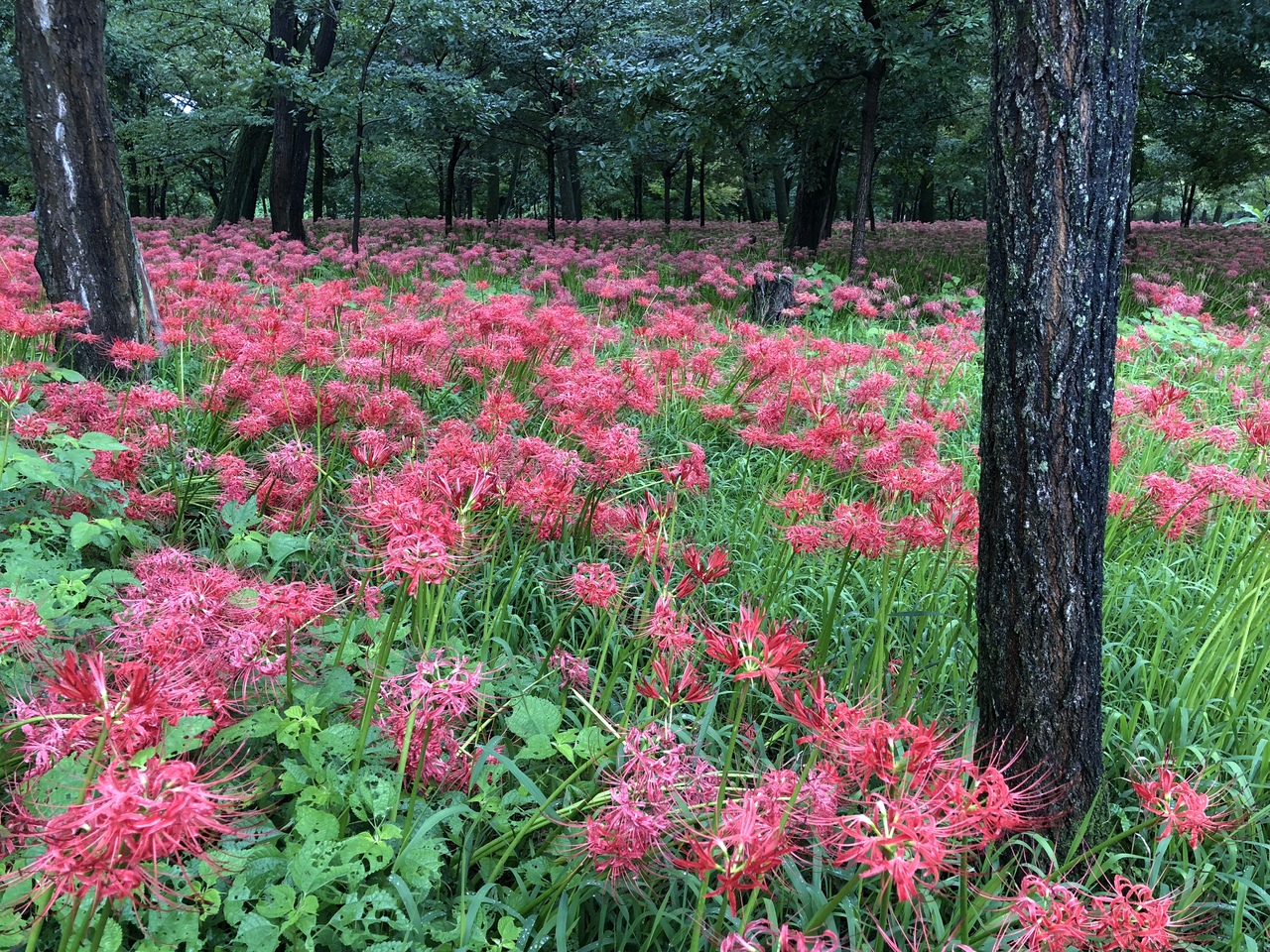 訪れる前の台風の影響で曼珠沙華はほとんどが倒れてしまって可哀想な姿でした。見頃も過ぎていたので入場料は無料でした。この日も雨のためか客足はポツポツ、出店も売り上げが伸びないようで、わらびもちのお店では大サービスしてもらいました。