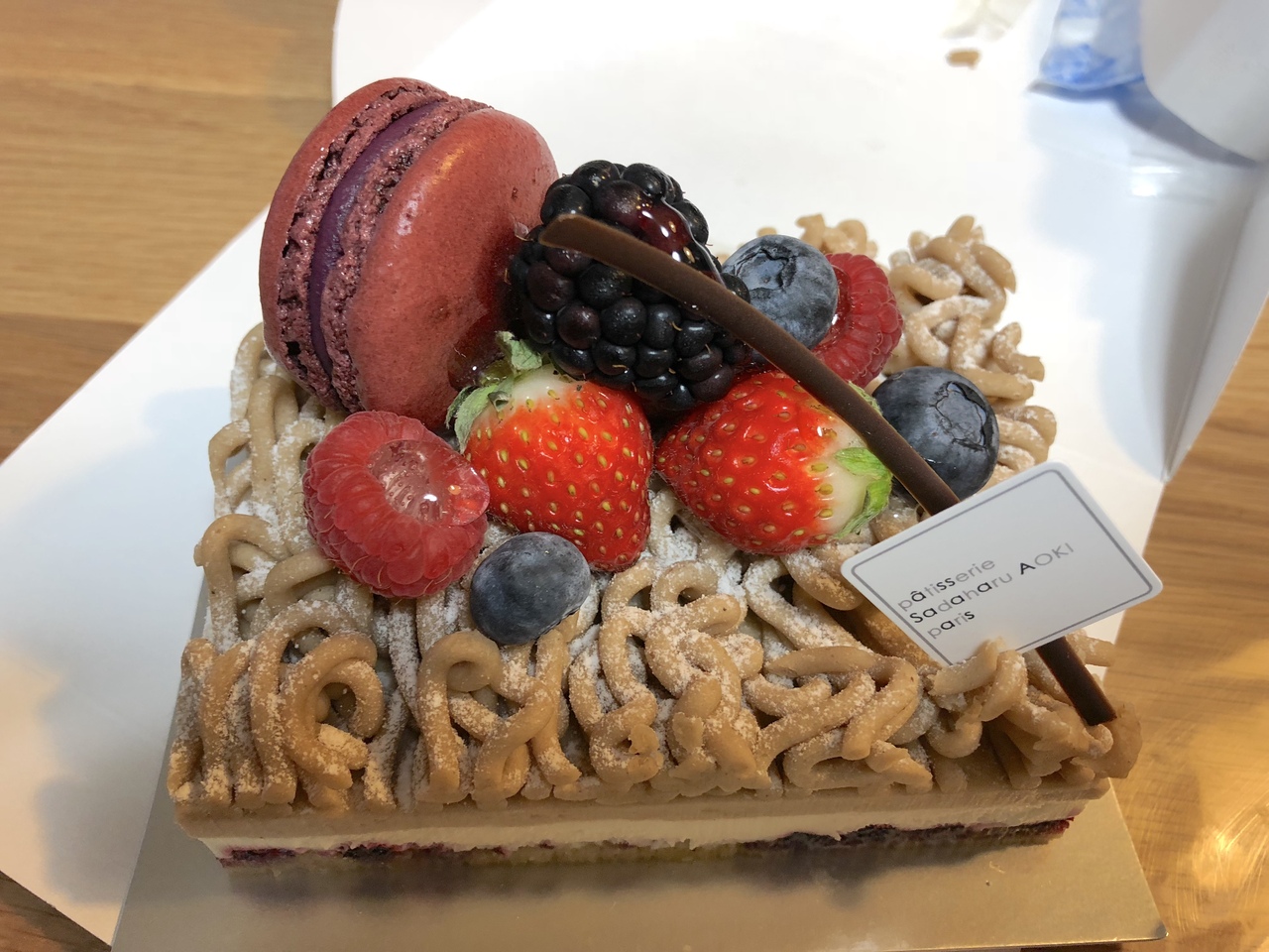 渋谷ヒカリエの地下に入っています。マロンの季節なのでモンブランのケーキを購入しました。ベリーの飾り付けが可愛いく見た目にも楽しいケーキでした。サダハルアオキといえばマカロンですが、ケーキの上にもカシスのマカロンが乗っていました。