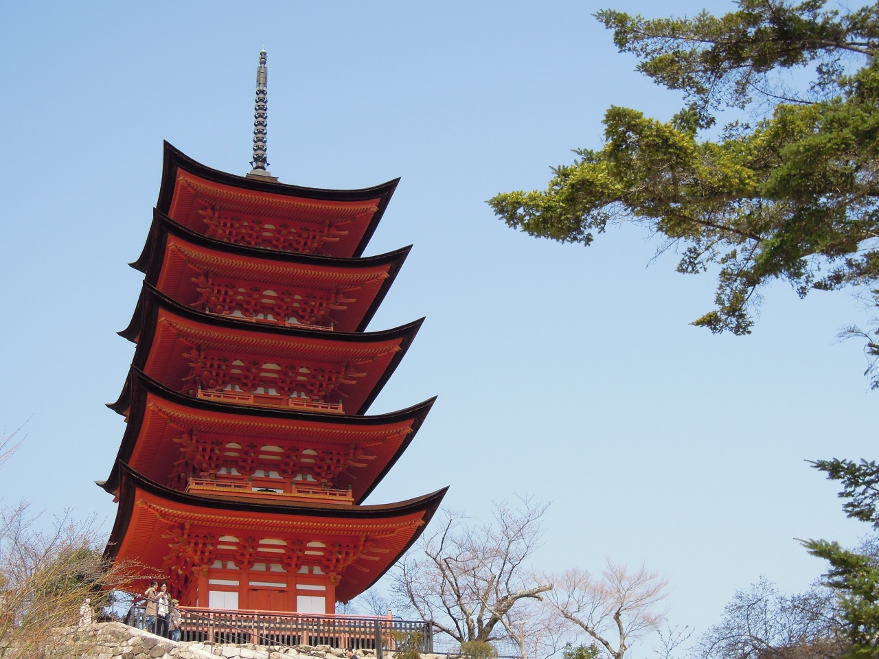 嚴島神社のすぐ側にあり、少し高台にあります。嚴島神社と共に国の重要文化財となっている宮島の名所です。朱塗りの鮮やかな塔が青空によく映えてとてもきれいで華やかでした。五重塔のちょうど下に桜が植えられていて満開になればさぞや美しい景色を見せてくれるはずです。