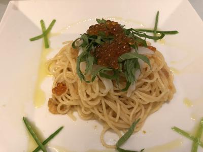 毎年、夏限定でメニューに出る生ウニとイクラの冷製パスタ、これ目当てに毎年必ず食べに食べに行きます。ウニ、イクラにイカまでのっていて、トッピングのシソが絶妙にマッチしています。少し細めで固めに茹でてあるパスタも塩加減もとても良いです!