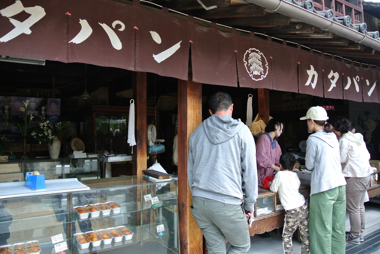 金刀比羅宮への石段52段目にあるお土産屋さん。登り始めてすぐのところなので、琴平駅からも15分ほどで来られると思います。名物は石松まんじゅう、舟舟せんべいなど。舟舟せんべいは焼いているところが見られます。見た目は瓦煎餅のような感じです。カリッとして香ばしかったです。