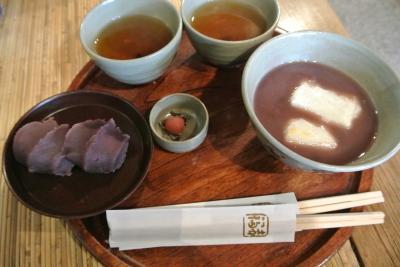 お土産ではなくて、やはり作り立てをその場で頂きたいと思い店内で食べました。4月上旬はまだ赤福氷は販売しておらず、赤福とぜんざいを頂きました。作りたてはほんのり温かくて、柔らかさが違います。お茶との相性も抜群です。