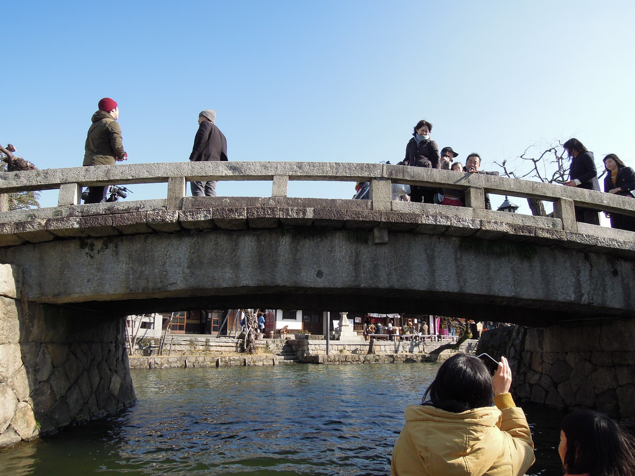 倉敷美観地区の倉敷川にかかる橋。大原美術館からすぐの場所です。ここで大勢の観光客が写真を撮るスポットになっています。橋の下には舟が行き交い、とても良い眺めです。明治前期までは木造であったそうですが、今は石造りの橋になっています。