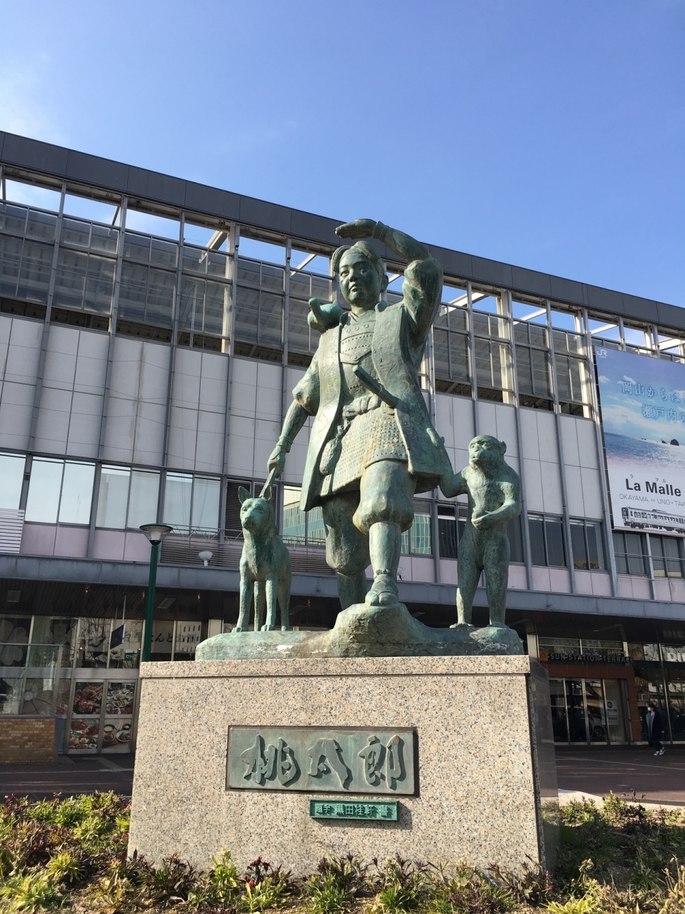 JR岡山駅東口を出たところにある広場に桃太郎像は建っています。サル、イヌ、キジを従えています。待ち合わせ場所にも使われている様子。観光客には写真を撮るスポットになっていて、絶えず人が周りに集まっていました。