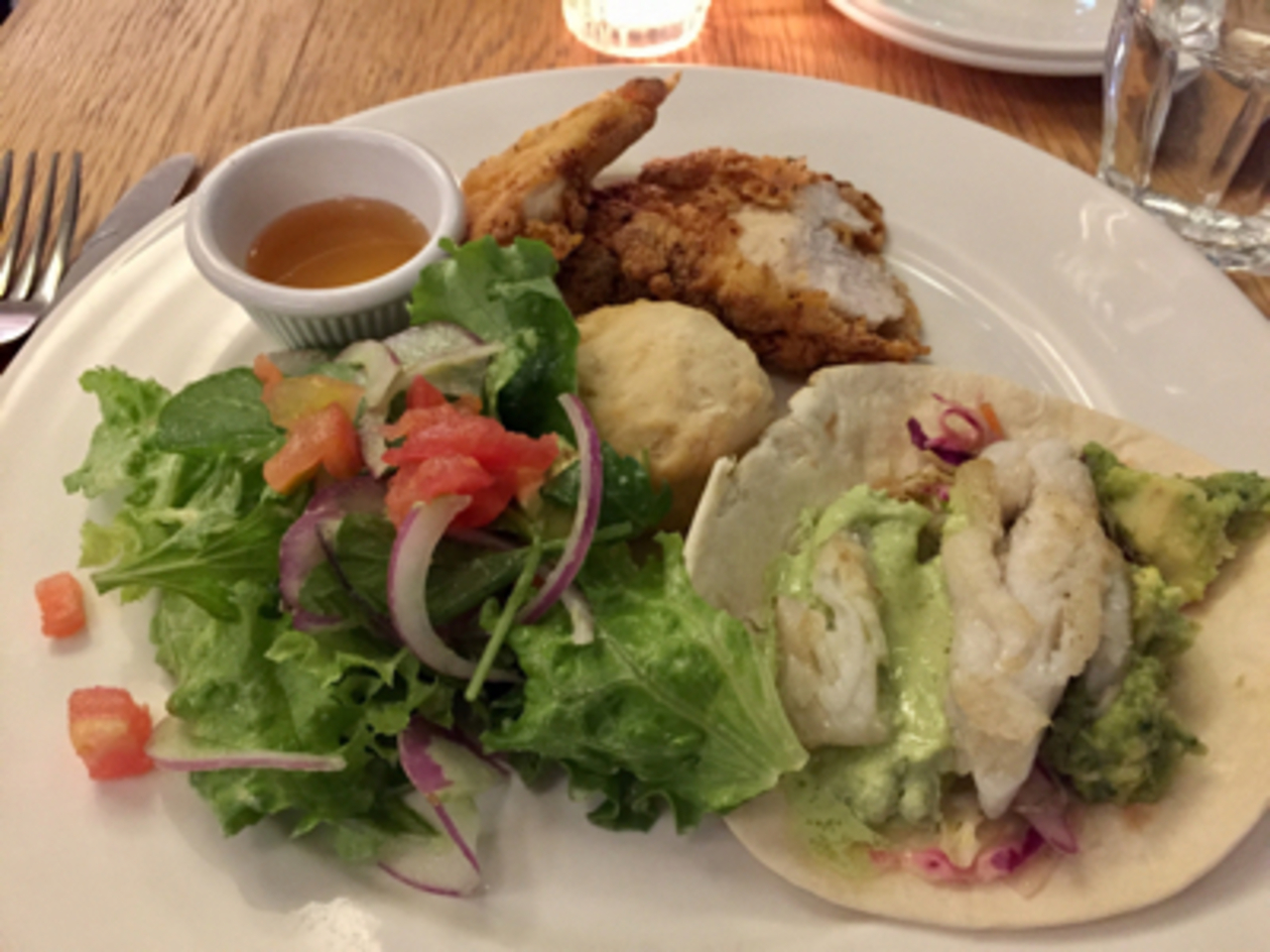 ブルベリーパンケーキが有名なニューヨークのお店。一度めはパンケーキを目当てに行きましたが、二度目は夕食に入りました。セットメニューで、スープ+メインのプレート+ミニサイズのパンケーキのセットにしました。プレートはフライドチキン、タコス、アボカドサラダがのっていました。なかなかボリューミーですがそこまでコッテリしていなくデザートのパンケーキも食べれてしまいました。