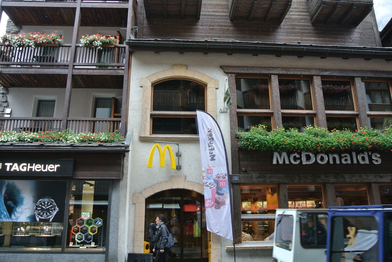 スイスは外食がとても高いです。マクドナルドも例に漏れず高額です。カフェやレストランで食事をするよりは安価ですが、マクドナルドに出す値段ではないと思いました。味も日本のマックの方が美味しいような…。外観は山小屋風でオシャレなんですけどね。世界一標高の高いところにあるマックだそうです。