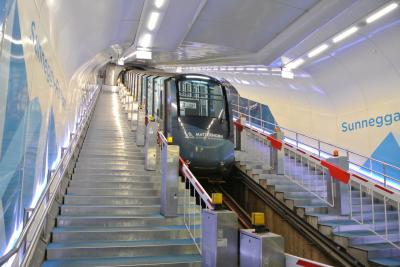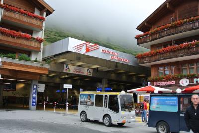 ゴルナーグラートの線路づたいに歩いて行くと、スネガへのケーブルカー乗り場があります。ツェルマット駅からは徒歩10分ほどです。ケーブルカーの車内アナウンスが日本語もあってビックリしました。乗車時間はわずか数分で一気に展望台へと上がれます。地下を通るので景色は見えませんが。
