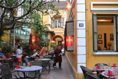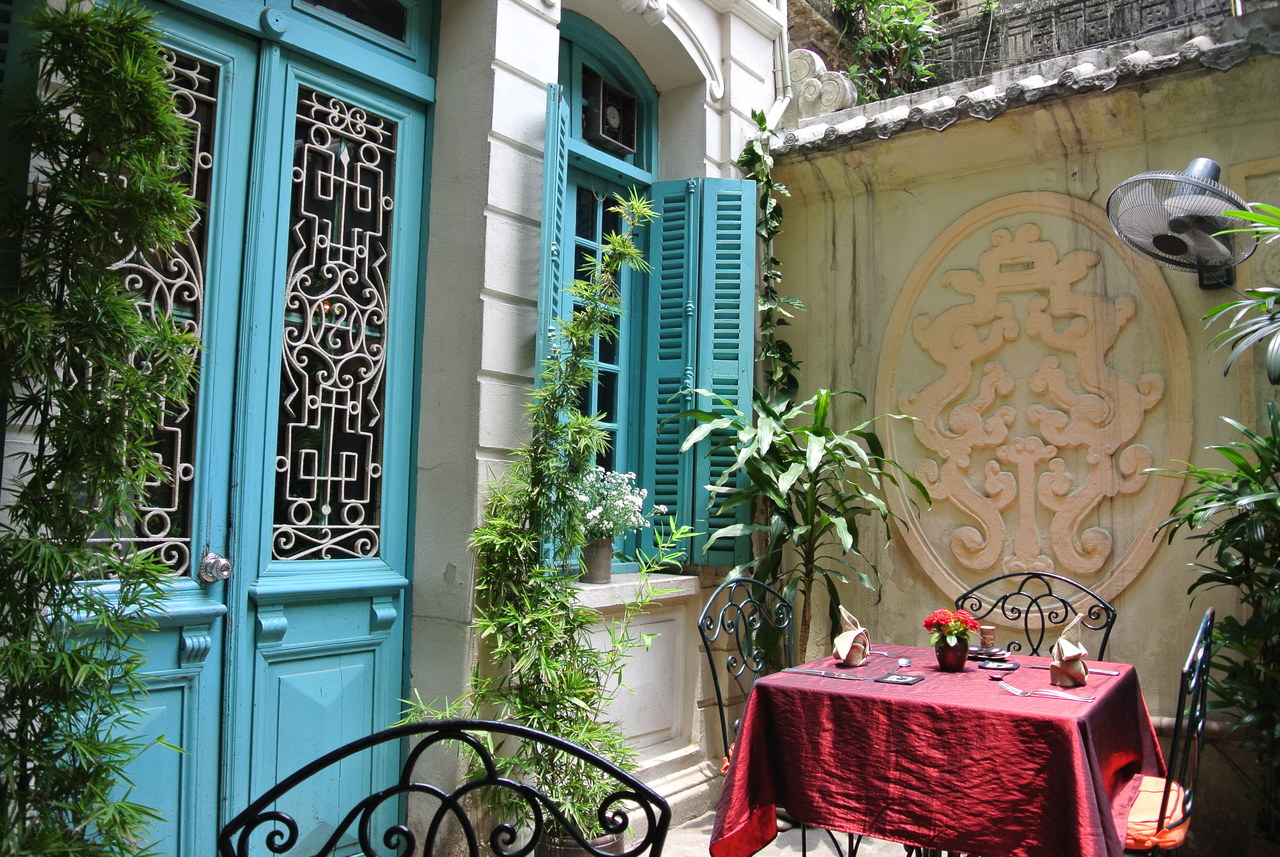 創作ベトナムフレンチのお店です。水色のドアと窓が印象的な素敵なレストランです。中庭のテラス席で食事できました。ランチはコースだとリーズナブルでおすすめのようですがアラカルトで注文しました。見た目もおしゃれな料理で味はなかなか美味しいですが少々値段が張りました。