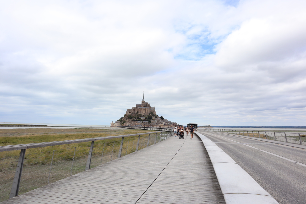 10代の頃から憧れていたモンサンミッシェル。いつか行けるのだろうかと遠い憧れだった場所を目の前にした時はただただ感動しました。あれだけテレビや雑誌やネットやいろんなところで目にして見飽きてるはずなのにこんなに感動が大きいなんてと思いました。レンヌから乗ったバスを降りてから2キロほど歩きましたが幸せを噛み締めながら歩きました。