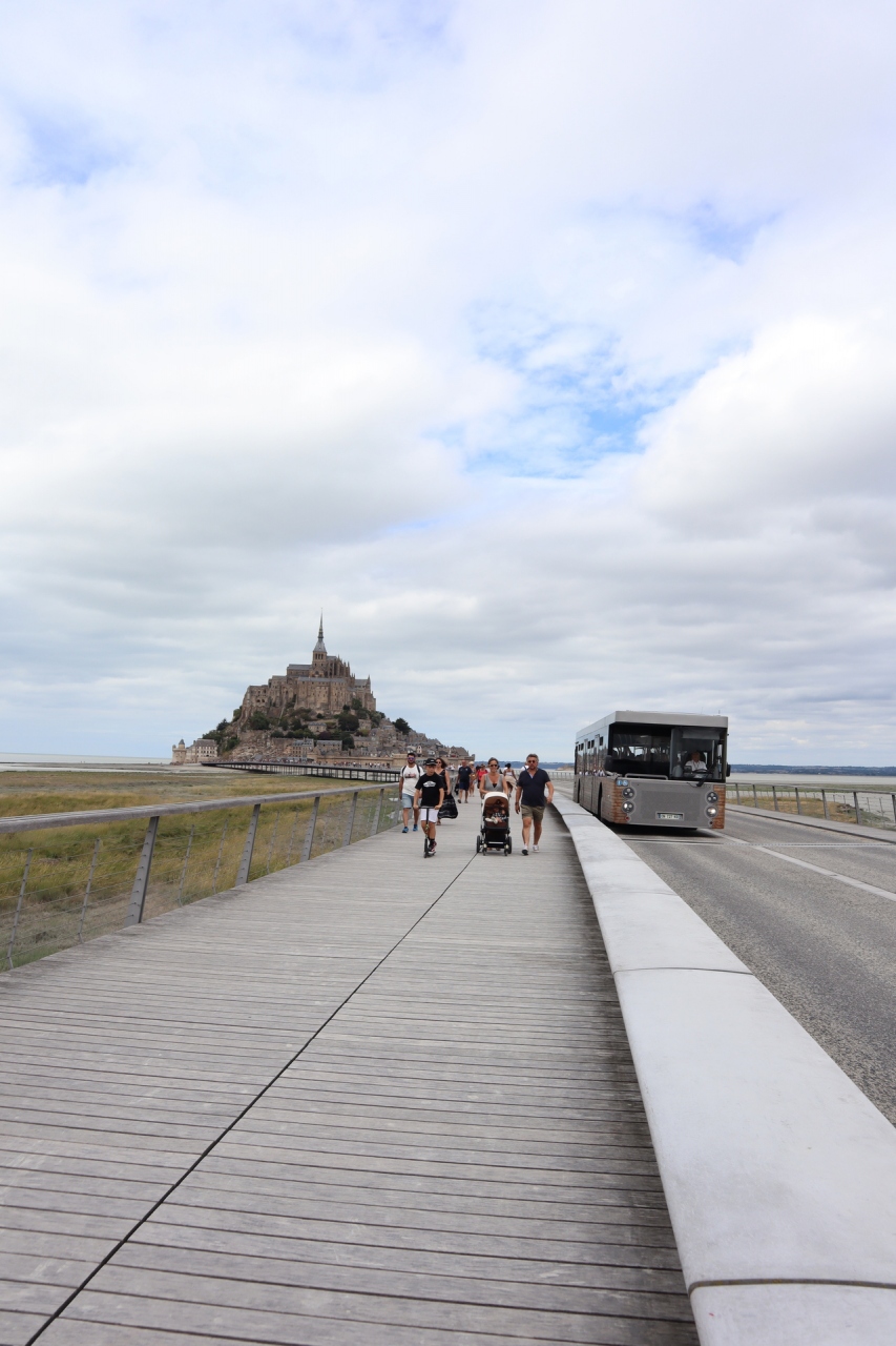 行きは歩きで対岸からモンサンミッシェルまで向かい、帰りはシャトルバスを利用しました。夏休みシーズンは何台ものバスがひっきりなしにピストン輸送していますが、それでもバスに乗るのには長蛇の列が出来ていました。