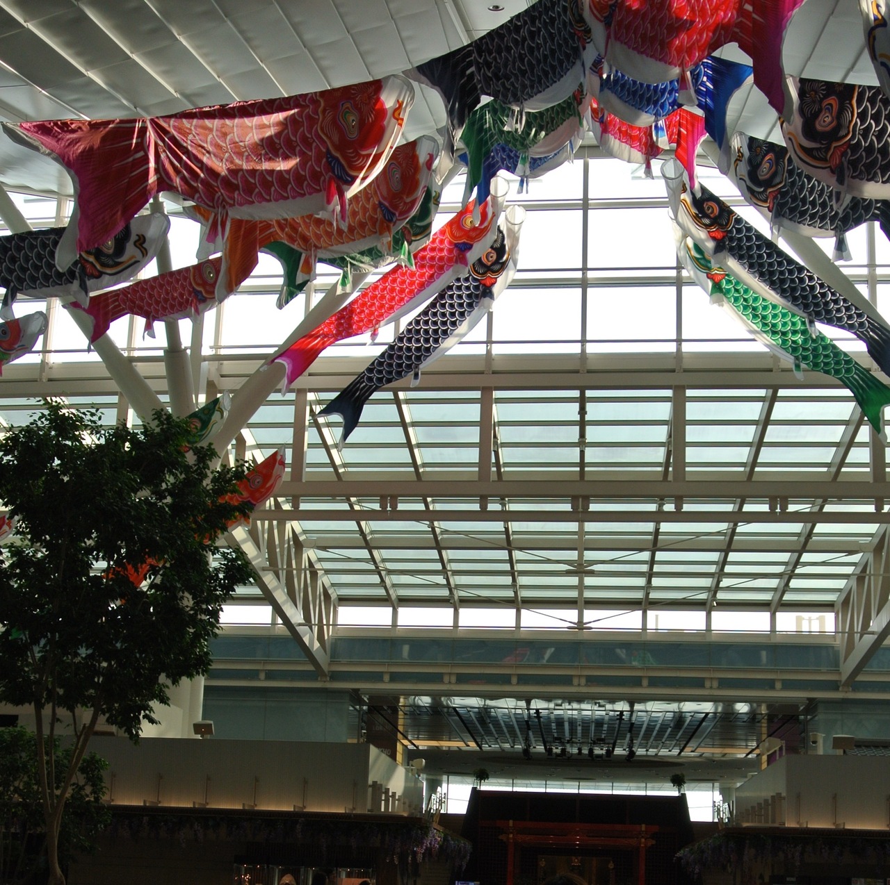 GWの出国ラッシュと重なったため、午前中の早い時間帯にもかかわらず混雑していました。出国審査や荷物検査もだいぶ行列でした。普段国際線は成田を使うことがほとんどなのですが、成田と比べるとコンパクトで使い勝手も良く、レストラン街の江戸小路の雰囲気も魅力的です。ちょうど5月の頭だったので、江戸小路の入り口にたくさんの鯉のぼりが泳いでいました。本物ではないですが藤棚もキレイでしたし、こういう演出はとても素敵です。
