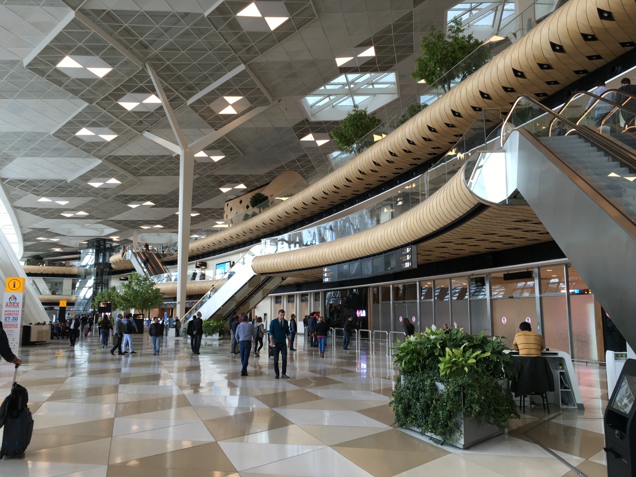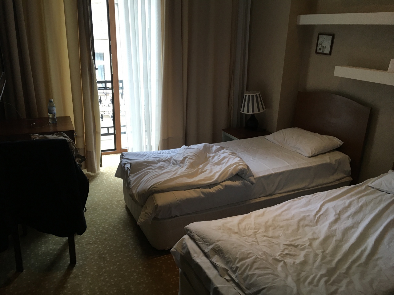 空港からバスでバクー駅へ。そこに停まっていたタクシーを捕まえて、ホテルへ。ただし、タクシーのおじさんはホテルを知らないようで、何度も知り合いに電話したり、止まってる別のタクシーに聞いたりして、ホテル手前の小道まで行けました。なお、ニザミ通りは歩行者天国なので、ホテルの目の前まで車は来れません。若干歩く必要があります。