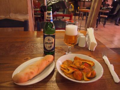 何にしようかと思っていたら、「メニューにはないけど、今日はジョージア産のキノコ料理がおススメだ」とのことだったので、それを頼むことに。料理は、まあ普通という感じですかね。そのキノコ料理と、パン、ビール2杯で39.4ラリ。トビリシに着いた最初の食事がここだったので、まあこんなもんかと思っていたのですが、あとあとルスタヴェリ通りの飲食店などを回ってみると、非常に高い価格だったと思います。