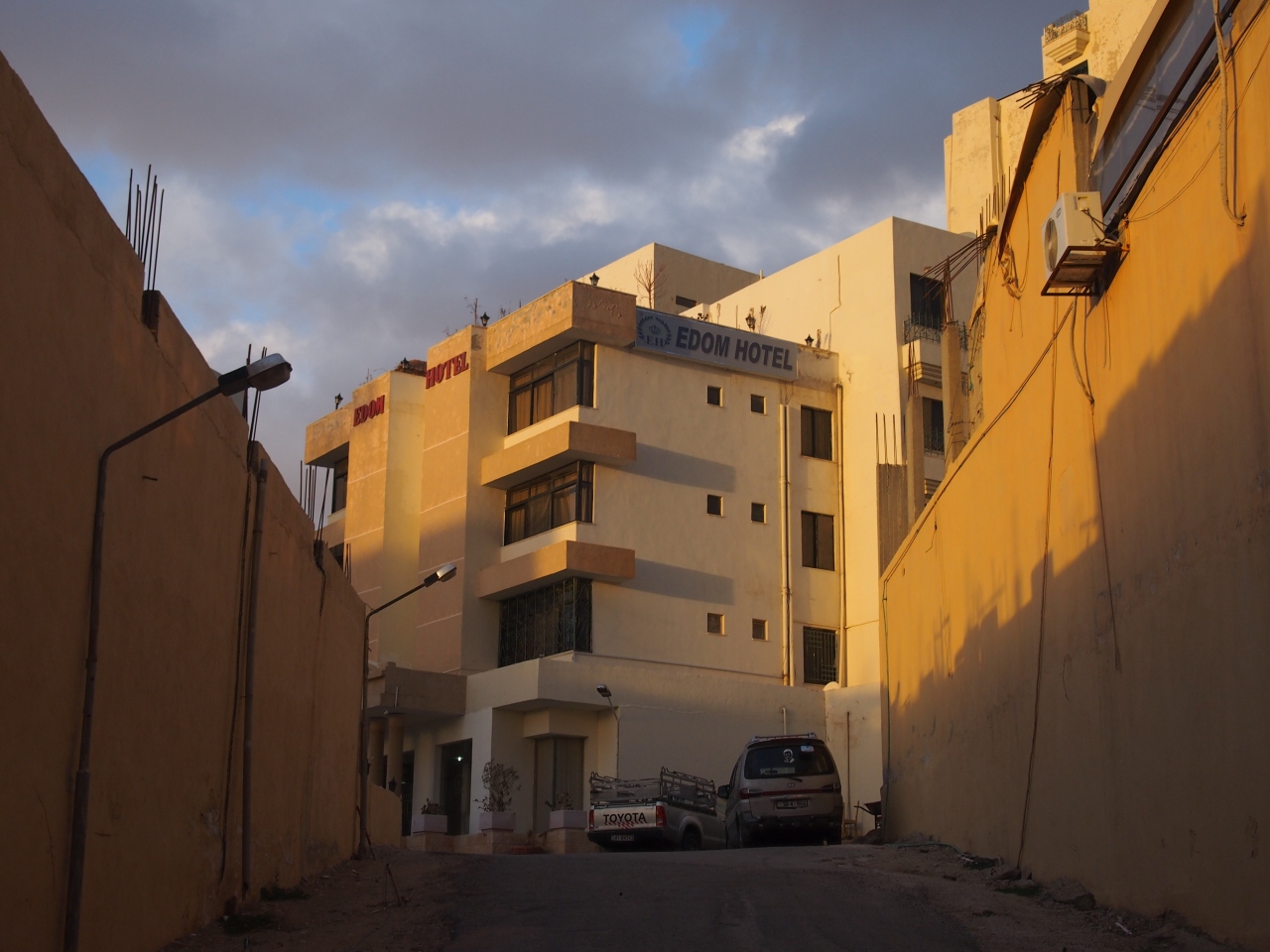 とりあえず、アンマン空港についてからホテルに行くまでが一苦労。空港から市内へは黄色いリムジンバスが一時間毎に出ているという情報を聞いていましたが、自分が空港から出られたのはリムジンバスの出発直後。バスの近くにいた人に聞くと、リムジンバスの間にもバスがあるとのこと。小型のワンボックスタイプのバスで、本当に大丈夫かなと思いつつも乗車。乗るときに途中で降りれるか聞いたら、ムジャンマシャーマリーまで停まらないとのこと。悪評高きムジャンマシャーマリーには行きたくなかったのですが、しょうがないかと乗車。しかし、アンマン市内に入ると普通にほかの現地の乗客たちは停まって下りて行ってました。なんだかなあと思いつつ、ムジャンマシャーマリーへ到着。バスターミナルに入ると、窓に東洋人が座っているのが見えて、現地のタクシー運転手の群れが。どこへ行くんだの質問攻め。アブダリのトレドホテルと言うと、5ディナールと全員が口揃えて行ってきます。その値段は高いという知識があったので断わっていたら、一人だけ4ディナールでいいと言ってきた運転手が。疲れてたし、もういいやとその運転手をチョイス。三菱車のタクシーに揺られてホテルに到着しました。ちなみに現地人の発音は「トレド」ではなく「トリド」でしたね。帰りに道端で拾ったタクシーでホテル前からムジャンマシャーマリーへ行ったら1.3ディナールくらいでした。