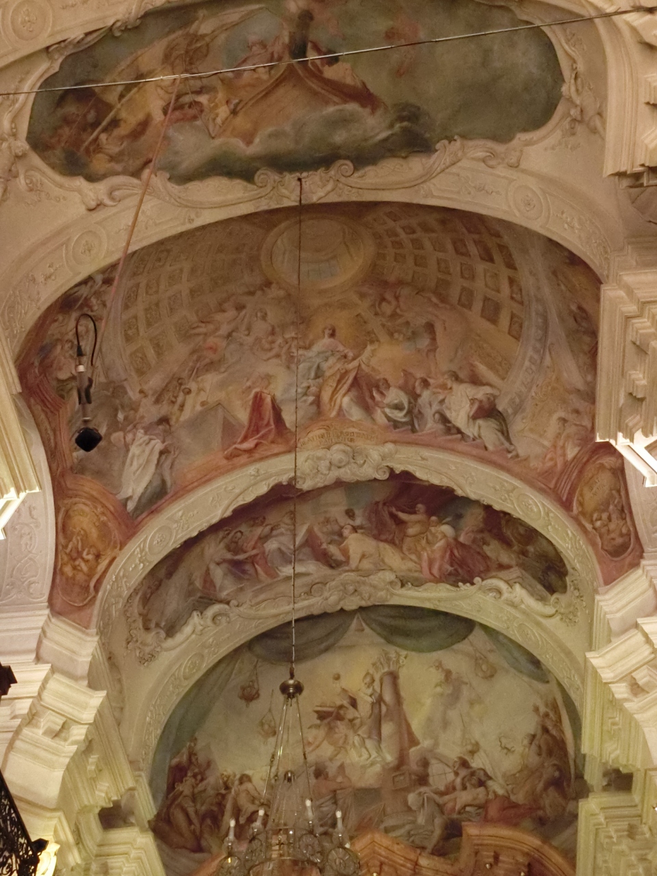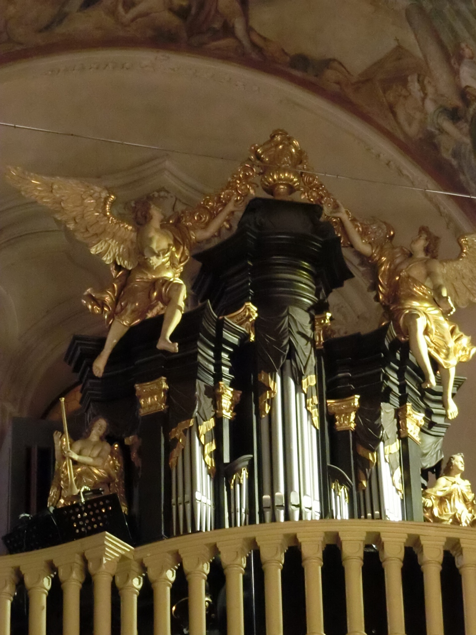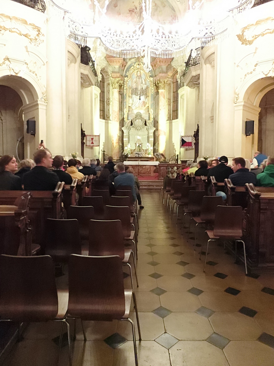 プラハ初日の夜のオルガンコンサートを楽しみがてら訪れました。入場券は教会入り口で初老のご婦人が販売していました。クレジットカードも使えます。20時からのコンサートチケットを17時頃に購入。街を散策してから、15分前にもドテッ来ました。入場は30分前から出来ます。よい席を取るためには、早めに行った方がいいです。私は一人でしたので、15分前でも最前列の補助席をとることが出来ました。天井が高く、天井装飾がすばらしい教会です。また、パイプオルガンも黒を基調に金の天使がかざられた立派な物です。1時間の管楽器とパイプオルガンのコンサートですが、教会でパイプオルガンを楽しめるコンサートはプラハ滞在中1度は参加してみる価値ありと思います。