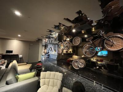 ロビーは木彫シックで壁には自転車の飾り、エレベーターで上がった廊下の壁にもイラストがあったり。