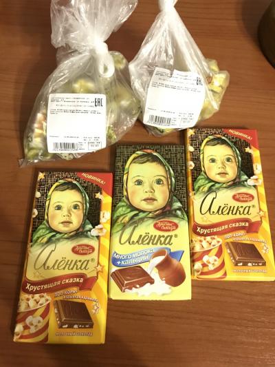 カリナモールで買ったお菓子。板チョコもここが安いですね。ポップコーンチ...