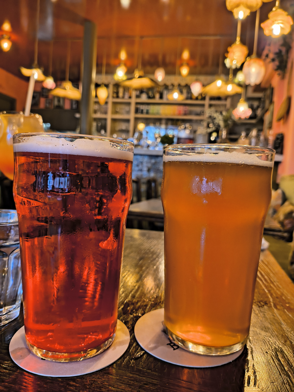 ビールに、レモネードとザクロシロップを混ぜた、赤いビアカクテル。