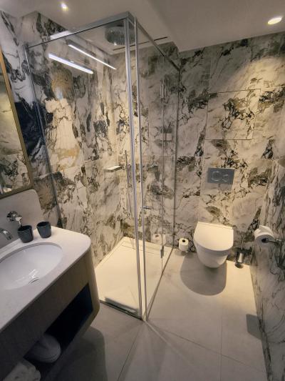 バスルームは、シャワーブースが段になっていて、水浸しの心配なし。