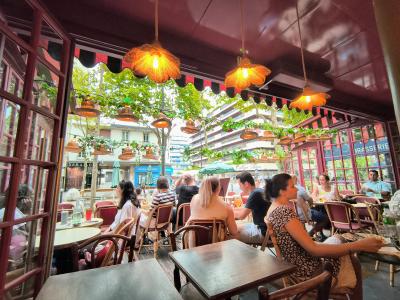 歩道が狭いのでテラス席はないものの、通りに面した扉?を開けて、店内から少し通りにはみ出た感じ。