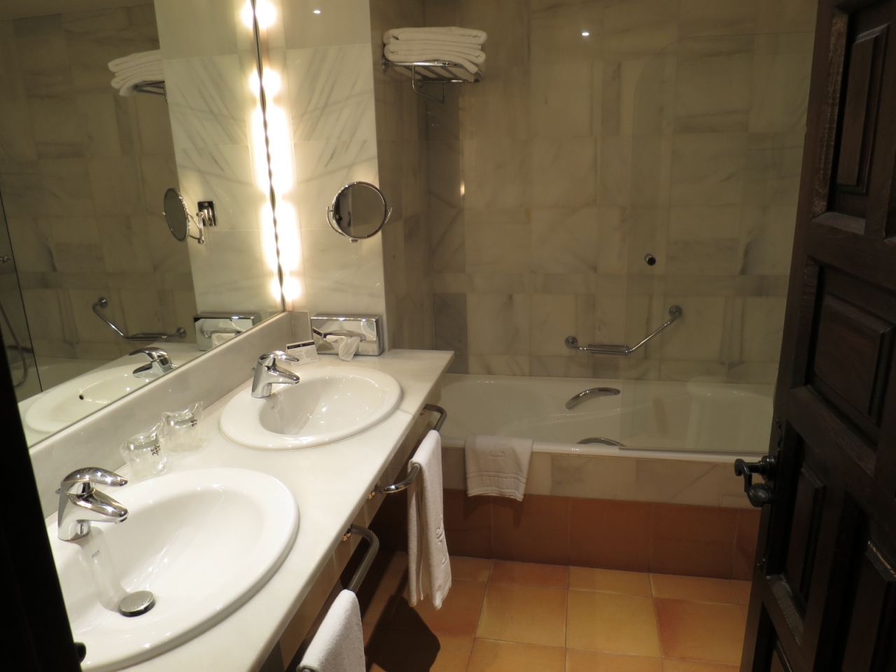 部屋は重厚な雰囲気で、バスルームは広すぎるくらい。