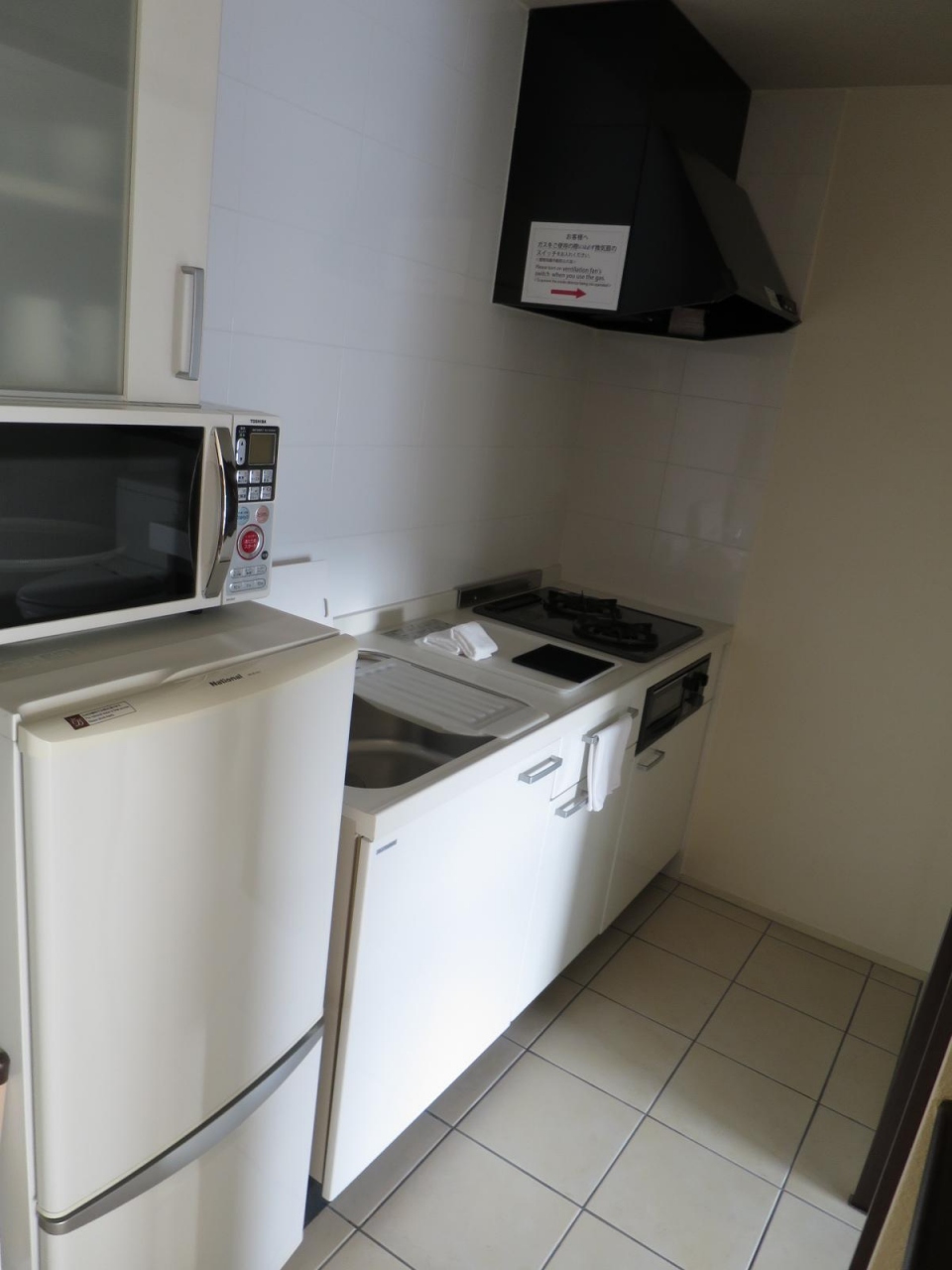 ミニキッチンには、冷蔵庫と電子レンジとIH。