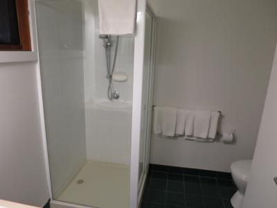 シャワーしかないが、ドライヤーと冷蔵庫もあり。