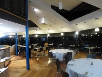 2階に上がると、海に面してガラス張りで、昼間は景色がいいのかもしれない。