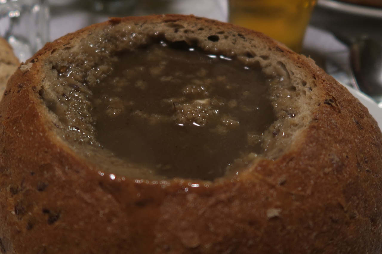 パンに入ったキノコスープとゴラブキを食べたが、キノコスープはパンまで食べれるが、量が多い。