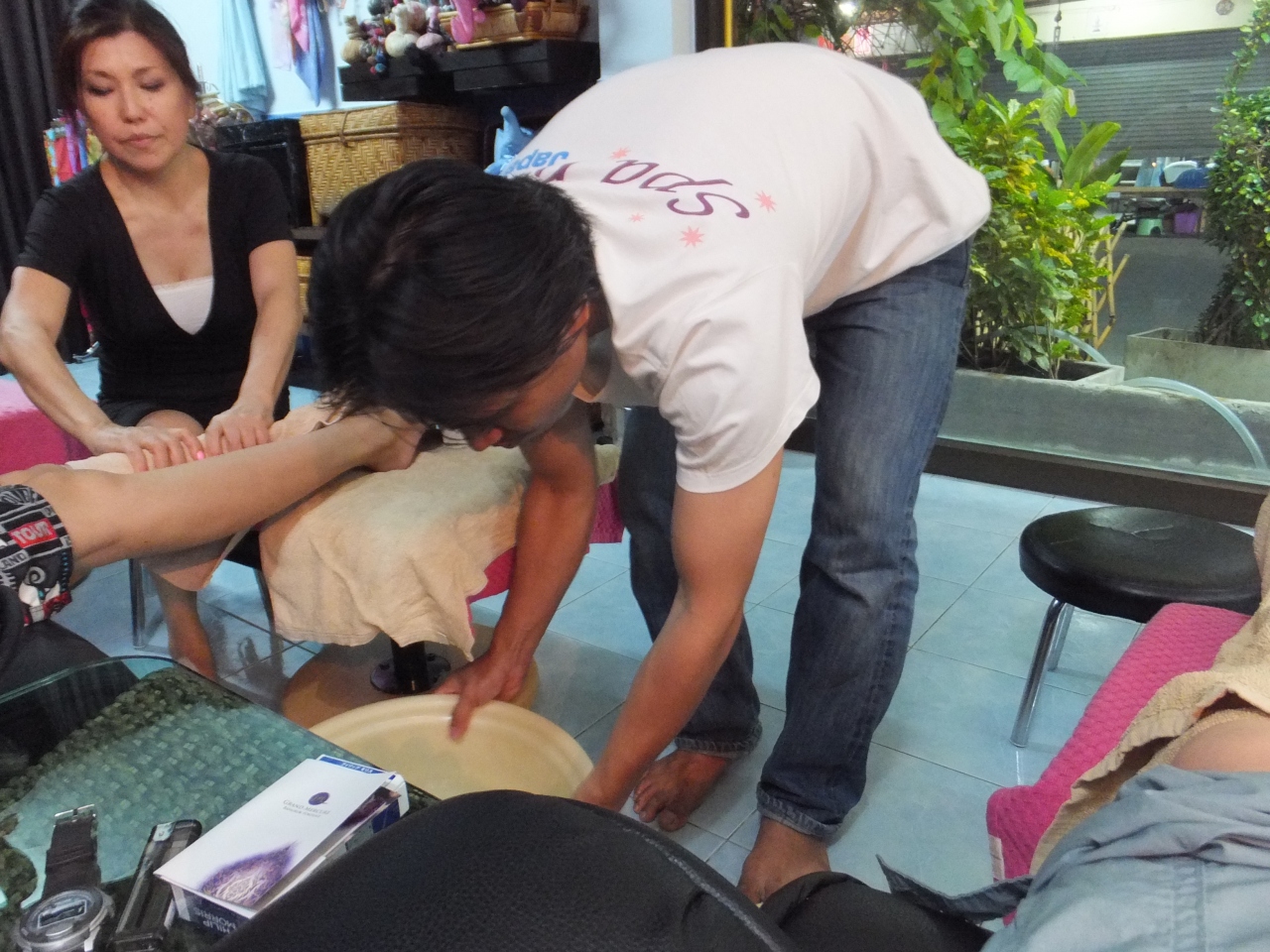 フットスクラブ、タイマッサージ、ハーバルボールで、