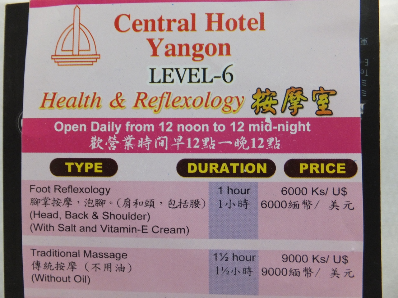 ミャンマー出入国時の前・後泊、各1日の宿泊でした。2012年8月10日・15日。