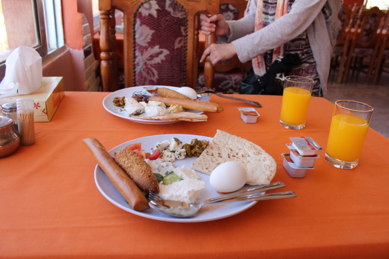 食堂の窓はとおり側に大きくあり、遺跡が少し見え、いい景色の中の朝食を楽しめました。朝食はパンとその付け合せで、この地域のスパイスなど正直口に合わないものも中にはありましたが、お腹いっぱいに食べるのにとくに問題はなかったです。