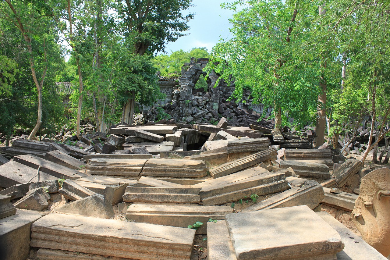 プリア・コーは、『聖なる牛』の略で、その名の通り2列に並んだ6基の祠堂の前に3頭の聖牛ナンディンが並んでいます。ただ、牛の形をしているのは1頭だけで、残りは残念ながら破損していました。この牛の背中には立派なコブがあり、思わず撫でてしまいたくなります。(何かご利益があるかも・・・・)