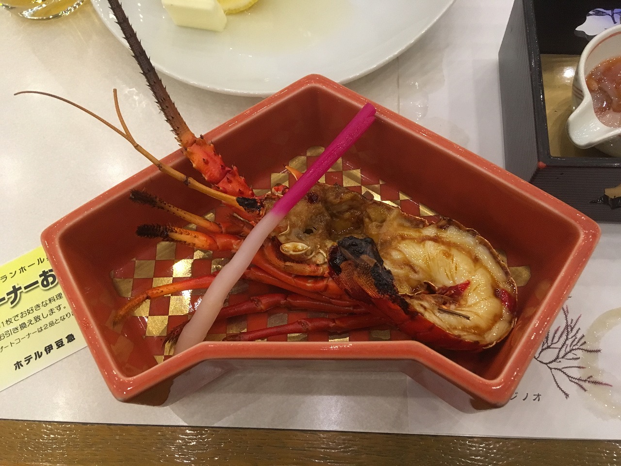 夕食は、アワビ・伊勢エビ・金目鯛の料理などの懐石と3枚のカードを渡され、そのカードで好きな料理をチョイスすることができました。