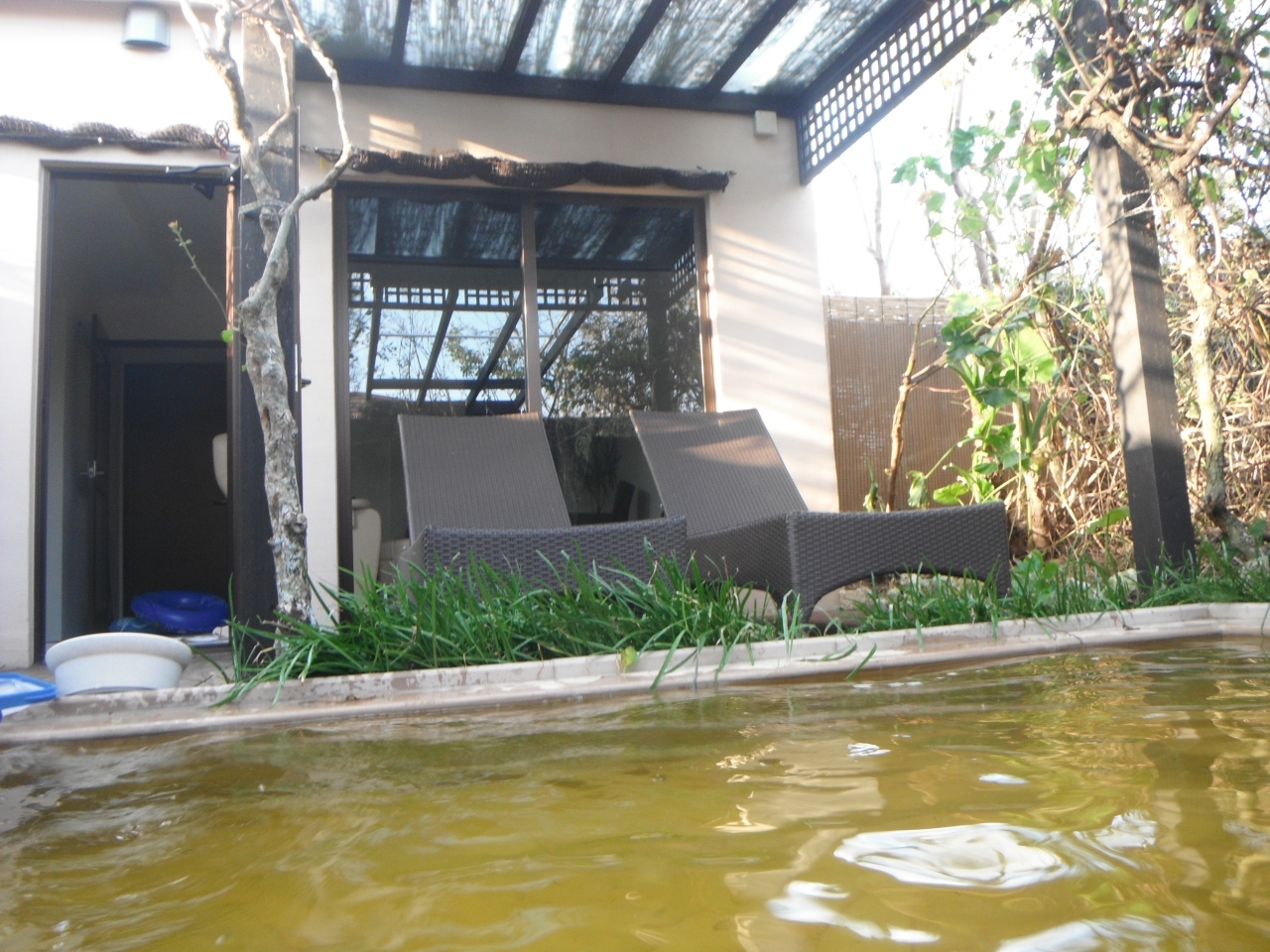 ふんだんな緑に囲まれた広いプールはとてもリラックスできます。滝とスライダー、浮き輪も備え付けてあって子どもも大人も楽しめます。プール脇にはハンモックや子どもの遊具もあるし、ホテル内にコインランドリーがあるのも便利。