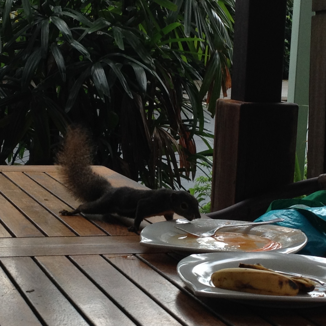 豪華ではないけれど焼き立てクロワッサンや点心、日替わりのローカルヌードルなどおいしいです。この朝食会場にはリスや小鳥がやってくるので子どもも大人も楽しめます。
