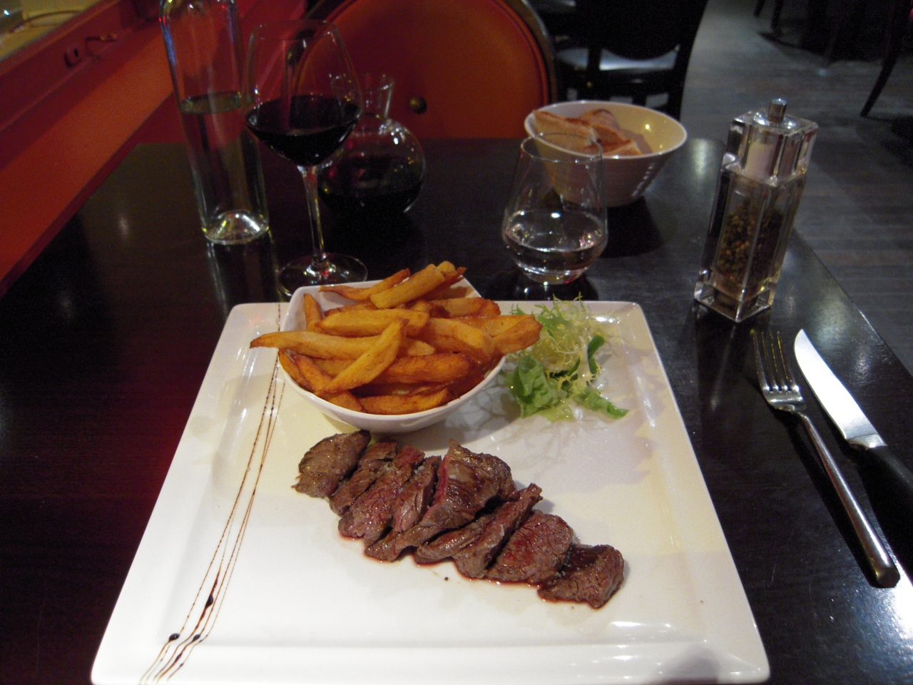 問題は、メインのステーキ。肉質はフランスのステーキ標準で悪くないのだが、火入れが弱いのか、表面の焦げが乏しく香ばしさに欠ける。ソース無しにしたが、塩がきつすぎる。弱すぎるよりは良いのだが、、、また、見た目重視の大きな四角の皿で切って出てくるが、皿がきちんと暖められていないので、一人での夕食の間でも肉が冷めてしまう。ステーキ調理の基本が甘いので、専門店を名乗るのはいかがなものか。