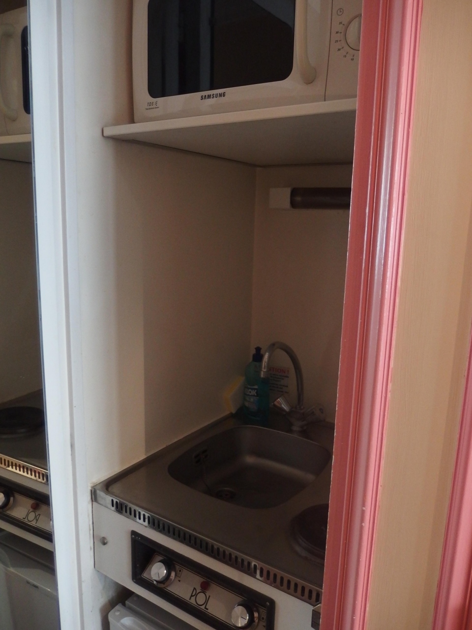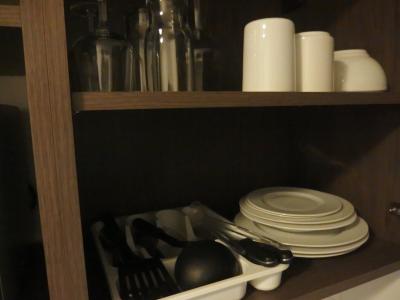 キッチンも狭いが、機能的で、食器や調理器具は一通り揃っている。ただし、4泊以上は追加料金を払わないと掃除・タオル交換などはしてくれない(部屋の約款より。私は選択せず)