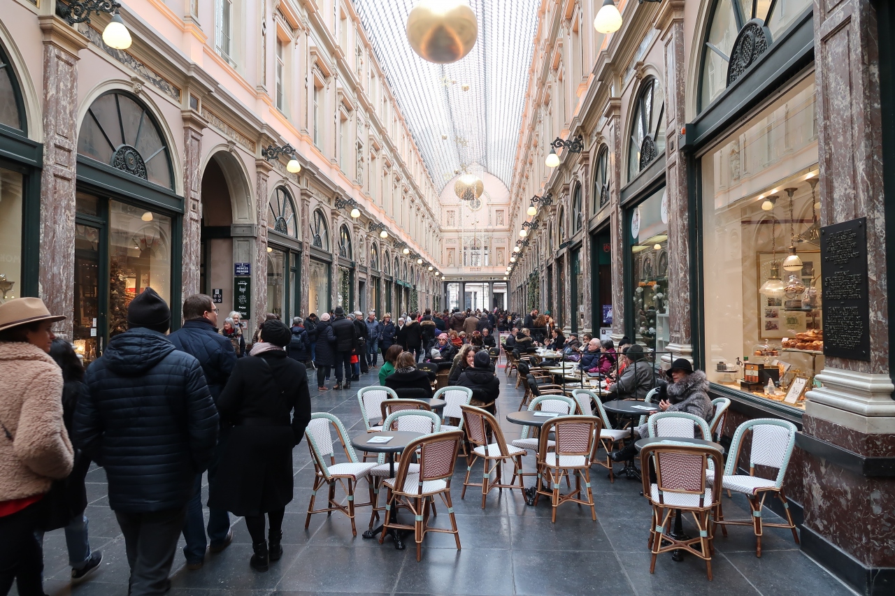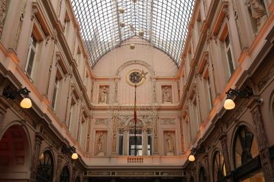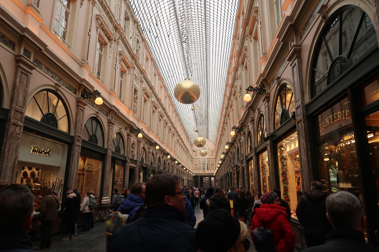世界最古のアーケード街として多くの観光客が訪れる名所。カフェや有名チョコショップが並び、世界遺産グランプラスのすぐ横。