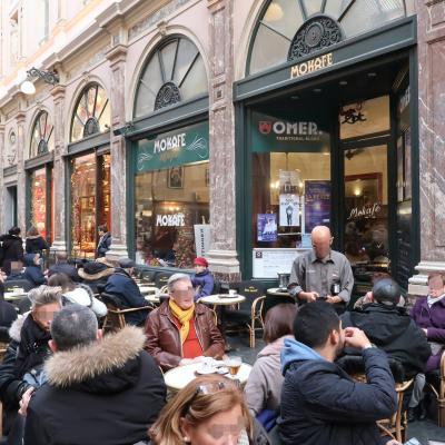 グランプラスのそば、アーケード街のギャルリーサンチュベールにあるカフェ。チョコレートなどのお土産物屋さんなどが多く並んでいる中にある。中心街を巡るときはほぼ必ずといっていいくらい前を通る場所なので、これを目的に行かなくても寄りやすい。混んでいても店員はなかなかテキパキと動く。値段もさほど割高ではないので、ブリュッセルのカフェの雰囲気を味わうにはお手頃です。