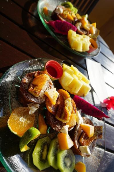 夕食は南国の食材を取り入れたもの。とてもおいしく独創性もあるように感じた。朝食はおしゃれに盛り付けられた南国フルーツとパンケーキをテラスで頂き、朝からテンションがあがる。部屋からは海が見えるし、5分くらい歩くと海に出ることができる。お風呂は宿に到着時に予約するシステム。好きな時間に入ることが はできないが、部屋にシャワールームがあるためシャワーのみでよければ特に問題はない。