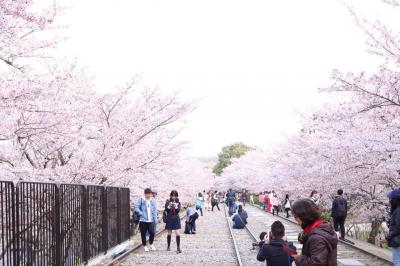 早朝の人が少ない時間帯を狙って行ったがすでにたくさんの人。意外と外国人(中国人や韓国人)が多い印象。ドレスの人、着物の人、セーラー服の人、いろんな人がいて面白い。桜は線路の上からみるので花が近く美しい。