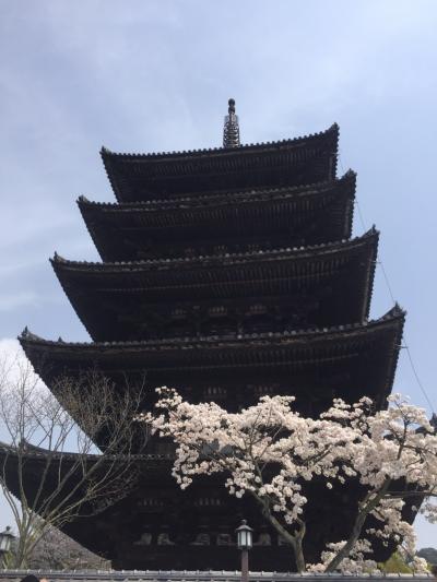 坂の下から見上げた時に綺麗に見ることができるよう電線が地面に埋め込まれているらしく、見上げると邪魔なものなく、街並みと塔の京都らしい景色を見ることが出来る。塔のすぐ下には桜の木があり満開だった。塔の近くから桜と塔を見ても綺麗。
