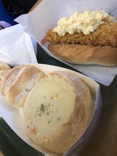 佐世保バーガーを食べるつもりが、見た目に惑わされエビフライロールに変更。エビフライが大きくパンにエビフライをはさんでいるというよりパンにエビフライが乗っているという感じでやや食べにくかった。クラムチャウダーはパンが余る。