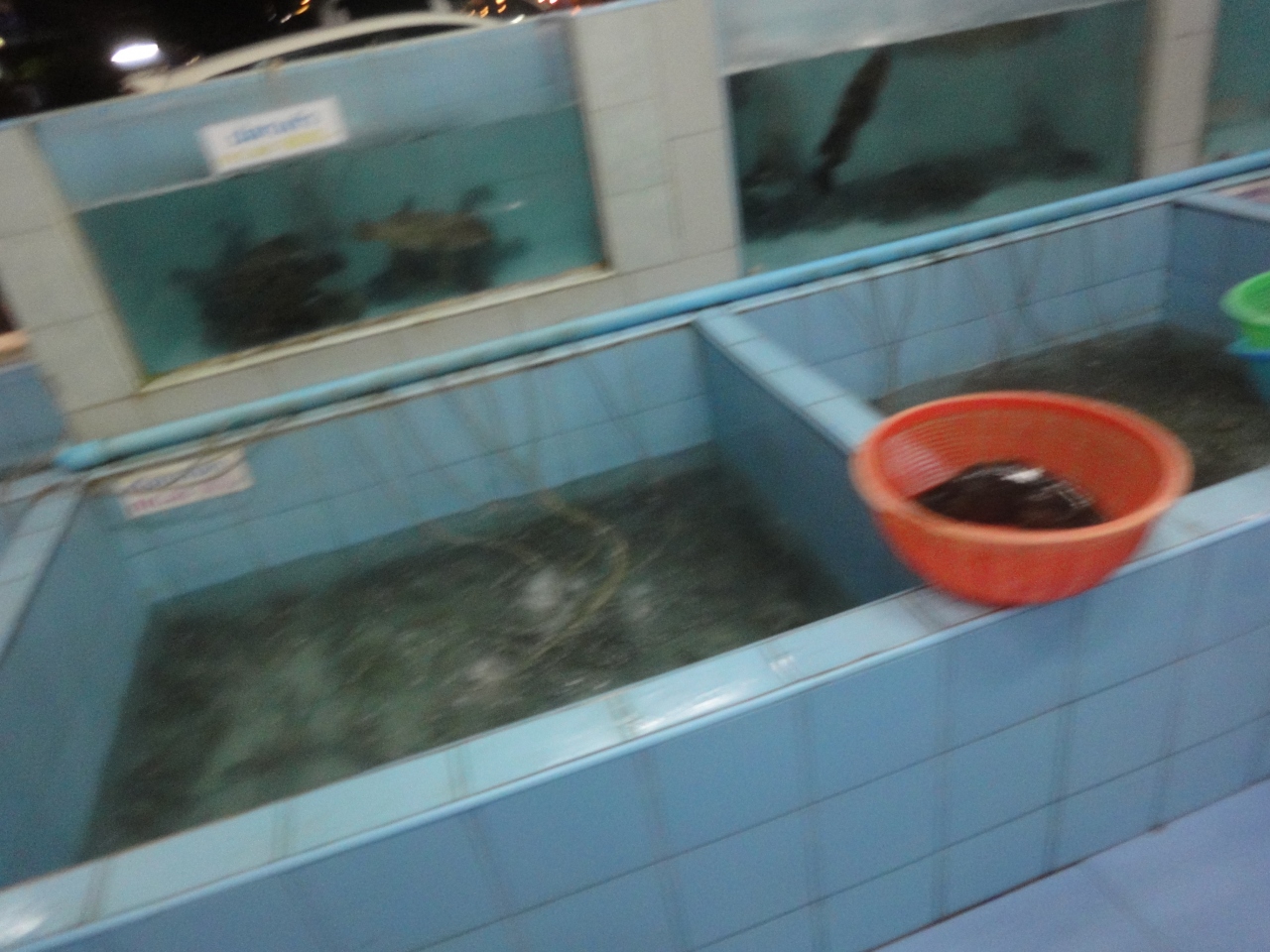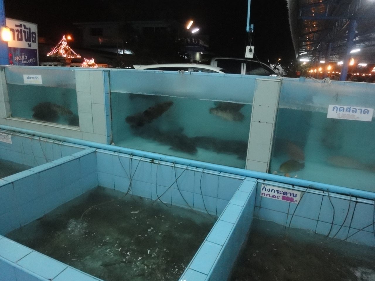味はちょっとしょっぱめだがおいしいです。今回はナクルアの市場でえびやかには調達するつもりだったので、いか、かに、エビのミックスのカオパット えびのつみれ トムヤムクン ココナッツの中に魚介をいれたやつ、それから魚とその卵をなべにしたもの。卵が直径1cm位で 白くプリプリです。名前解りません。いけすにはいつものように魚等が泳いでいます。- 旅行時期