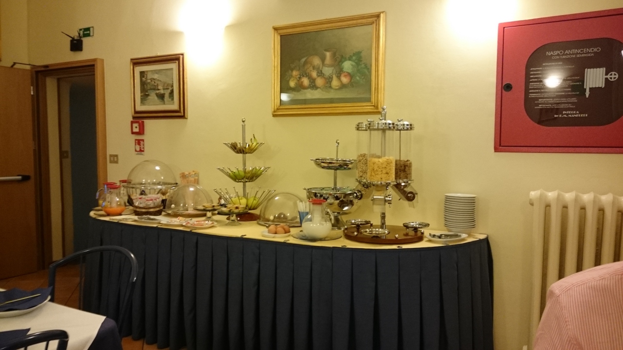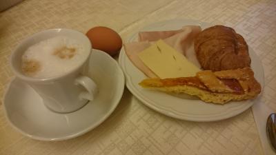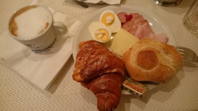 朝食はヨーロッパのホテルで良くあるコールドビュッフェ。おかず系はハム・チーズ・茹で卵のみで、甘いパンの種類が豊富でした。