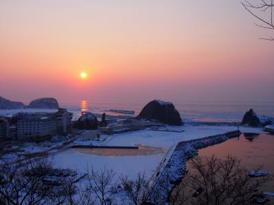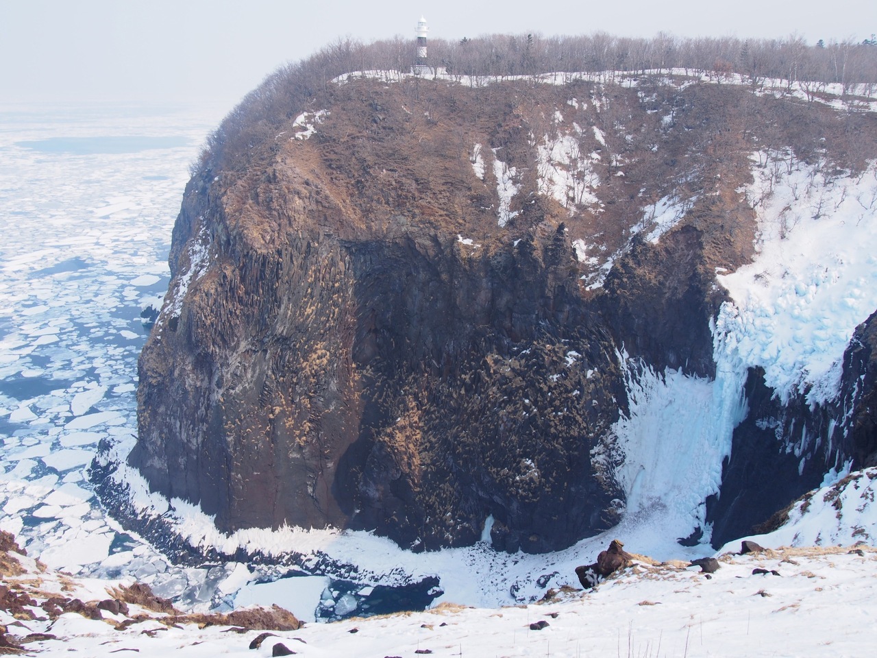 断崖絶壁の氷った滝と流氷を一緒に見ることができるので迫力があり、とても良い景色です。